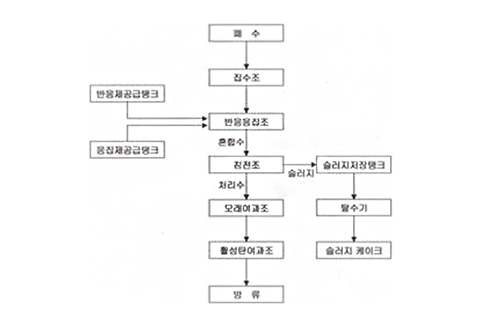 집수조에서 유입된 폐수가 반응조 및 응집조에서 반응제 및 응집제의 투입으로 인해 슬러지의 응집을 발생시켜 침전조를 통해